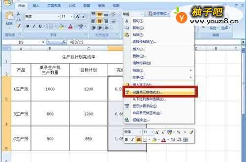 3、选中单元格,右击鼠标,选择【设置单元格格式】。