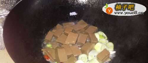 3起锅烧油放葱花和鸭血翻炒,加点白醋或料酒去腥。