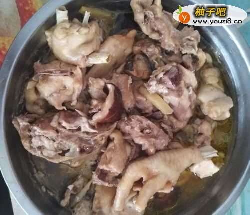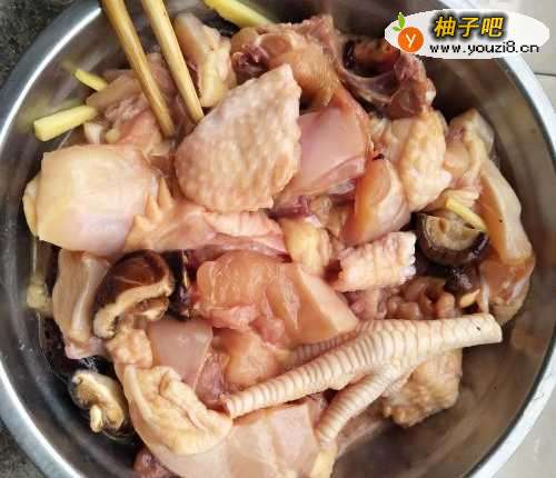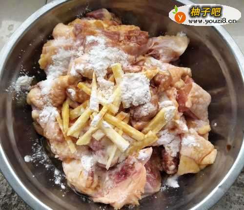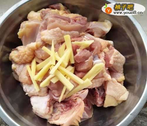 3第三步:准备好适量的生姜切成丝状放到鸡肉上面,如下图所示。