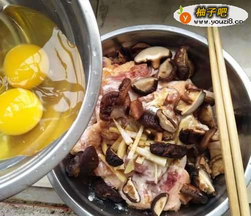 5第五步:将泡好的香菇放到鸡肉里面并加入适量的蛋清,注意不需要加入蛋黄,如下图所示。