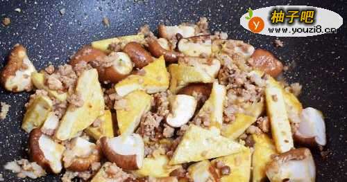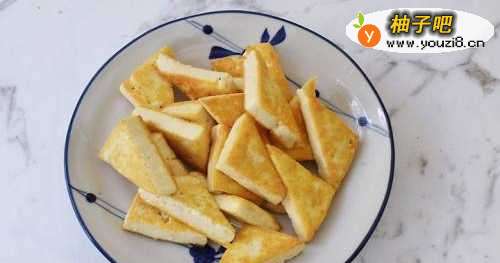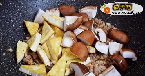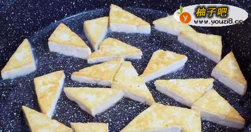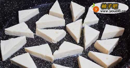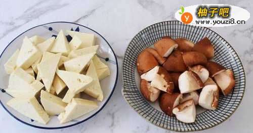 豆腐切成三角形的厚片,香菇洗净去蒂切成小块