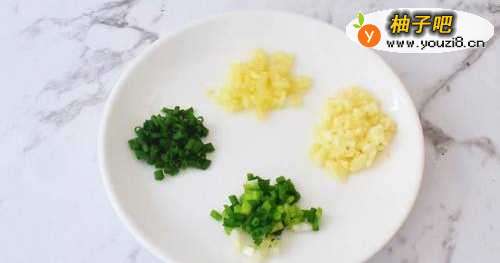 2蒜切末,姜切末,葱切葱花,分开葱白和葱青