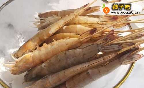 冲洗虾,去除虾丝,打开后盖,取出虾串,然后用竹签串在一起。