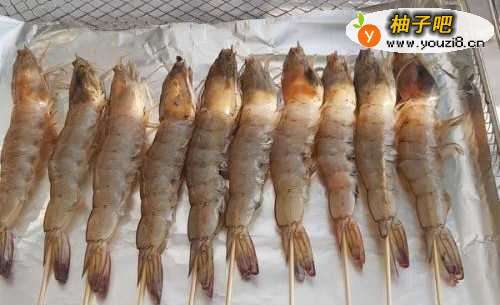 2用锡纸盖住烤篮,把处理好的大虾摆好。
