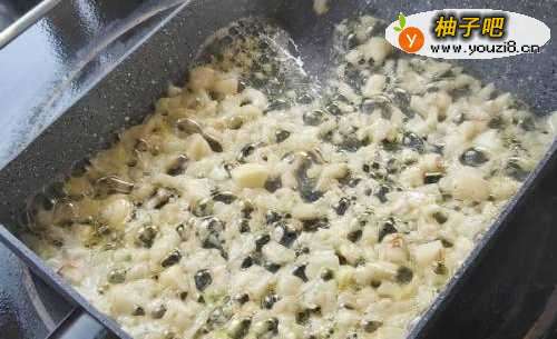 3将黄油在小锅中融化成液体,倒入蒜末,炒至香。