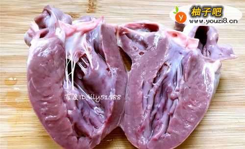 把猪心从中间对半切开,把里面的血块用清水冲洗干净。再把筋全部切掉,切成片备用。
