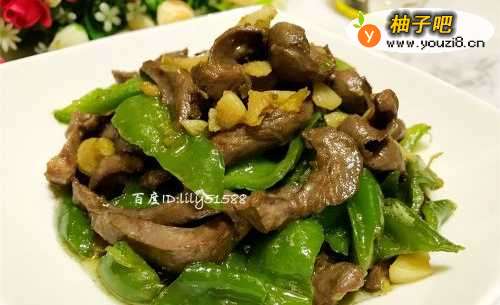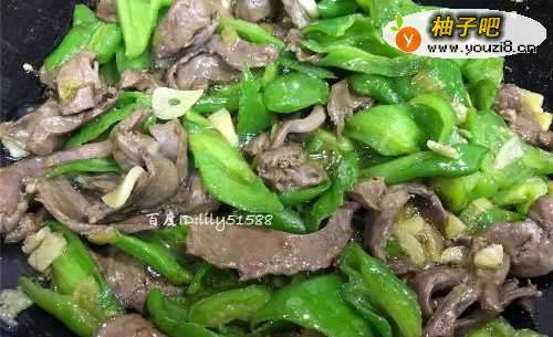 6猪心炒断生之后,放入青椒块一起翻炒1分钟。