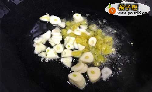 4烧热锅多放一点油,把泡椒和蒜片先放进去炒出香味。