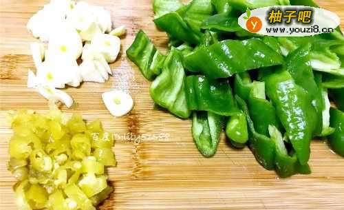 3将泡椒、青椒和大蒜洗干净。泡椒剁碎,青椒切成大块,蒜切片备用 。