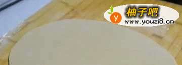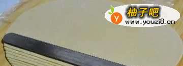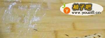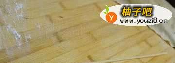 22.面板上撒些薄面,将面团擀成长方形的薄片,厚度约3mm左右;