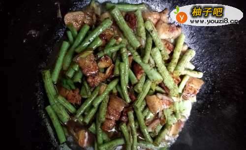 6然后倒入豇豆一起翻炒,炒匀后倒半碗水,焖煮。