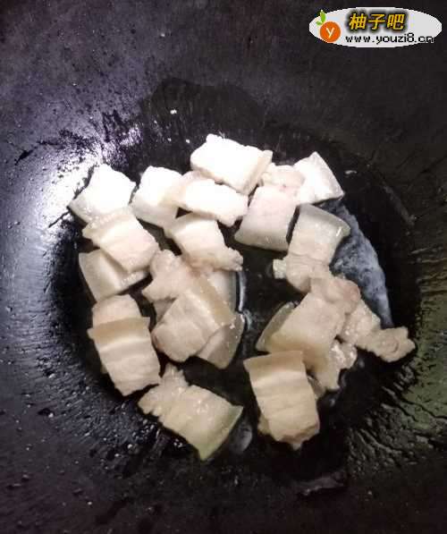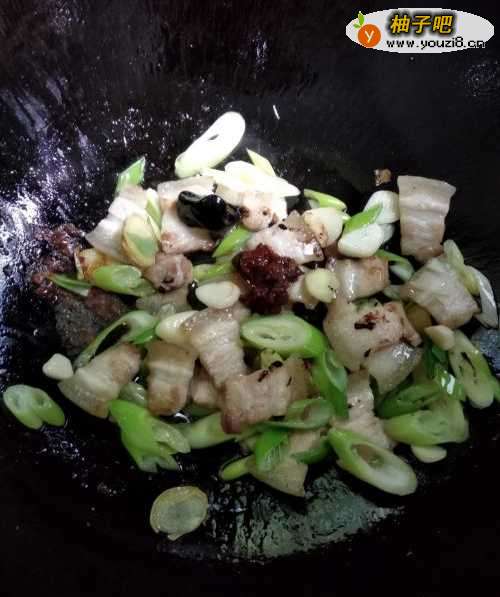 4锅里放油烧热,放五花肉翻炒,炒出香味后放大蒜、大葱生姜翻炒。