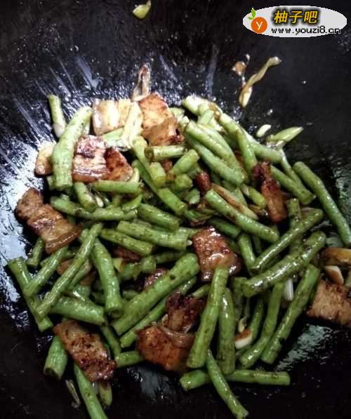 7汤汁收干后关火,盛起,这样好吃的豇豆炒回锅肉就做好了。