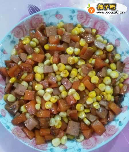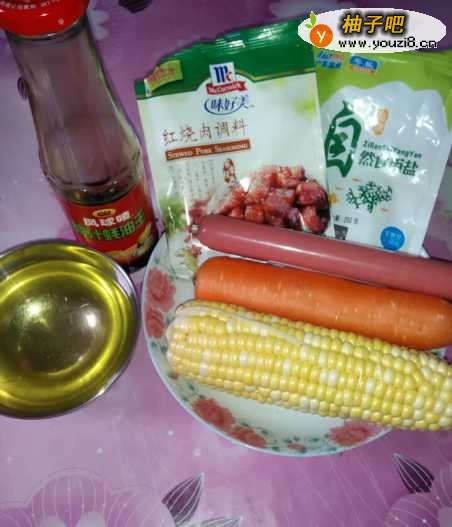 食材有玉米、胡萝卜和火腿肠。调料有油盐、红烧肉调料和蚝油。做这道菜不需要放太多的调料,这样我们才能吃出这几种食材的原味来。