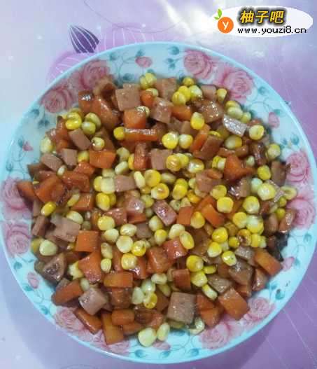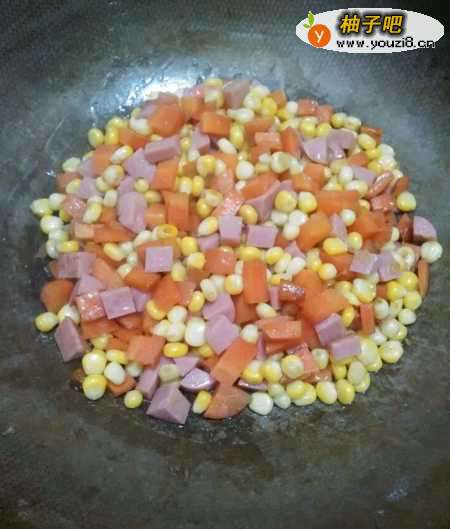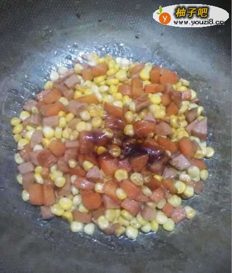 5下一步是倒入火腿肠颗粒和玉米胡萝卜一起翻炒。翻炒两三分钟左右就可以了。