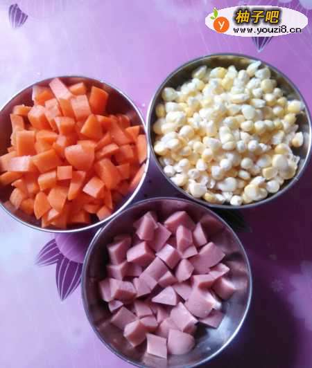 2然后我们把玉米棒剥成玉米颗粒,把胡萝卜和火腿肠切成小块颗粒状,分别放在碗里备用。