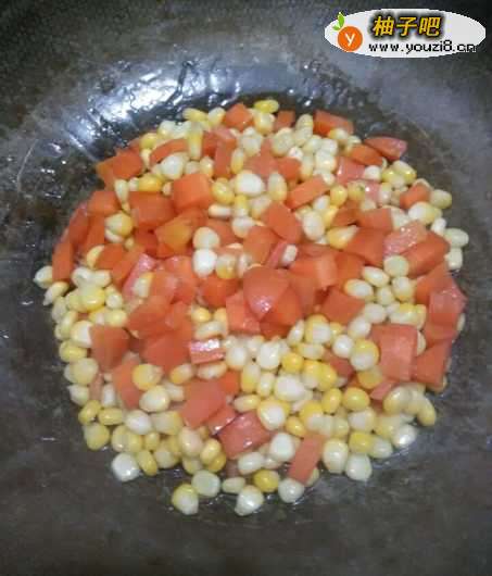 4然后再倒入玉米粒和胡萝卜一起翻炒。炒这道菜的过程一直开着中火就可以了。玉米粒和胡萝卜一起翻炒5分钟左右。
