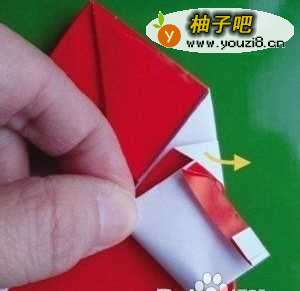 11把底部再往上折,把尖角塞到上方箭头处,然后再把箭头处的白色三角往外拉,效果如图2。