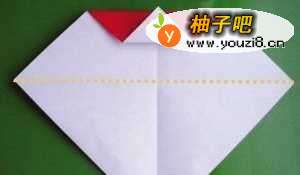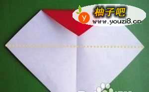 6再将此顶点向下折,顶点和对边中点贴合,然后翻过来到红色的一面。