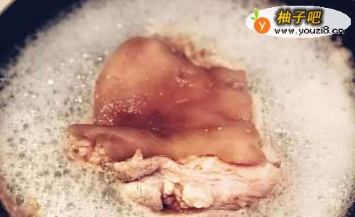 肘子洗干净,下水加料酒,煮开去血沫,捞出过凉水洗干净。