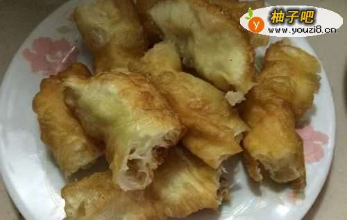 7然后在白糖上放一块油条,提起纱布一边朝另一边裹,裹成自己想要的形状。