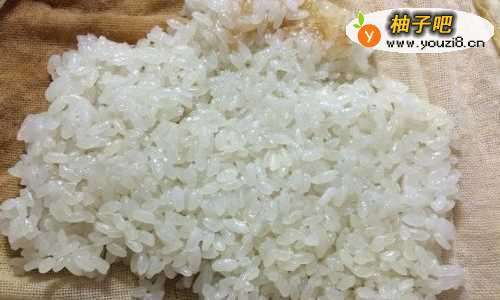 5纱布垫底,放上一点蒸好的糯米饭(热的哟),铺平,可以用勺子压。