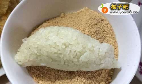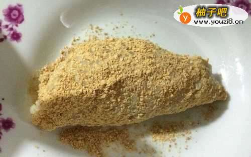 8取出糯米团放到黄豆面里滚一圈,沾上香喷喷的黄豆面,好吃的糯米团就完成了。