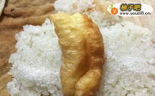 6均匀的宰糯米饭上撒上一层白糖,看个人爱好了,也可以不放。