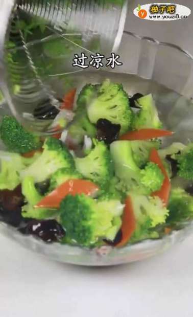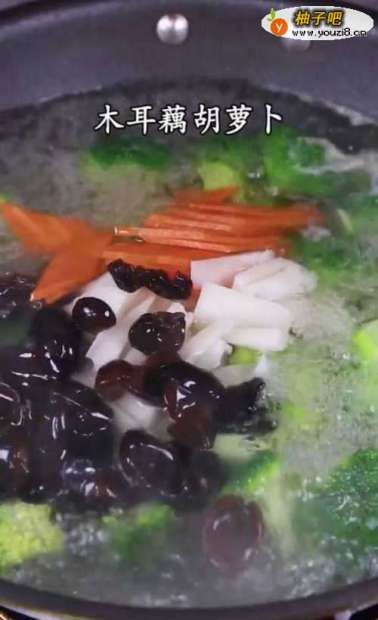 3水开加盐,几滴油,下西蓝花、木耳藕胡萝卜,焯水捞出