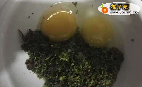 先把椿芽洗干净彻细,再打两个鹅蛋,如图。