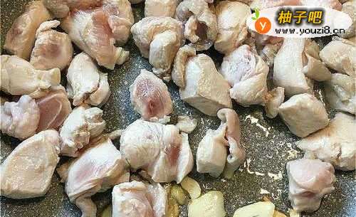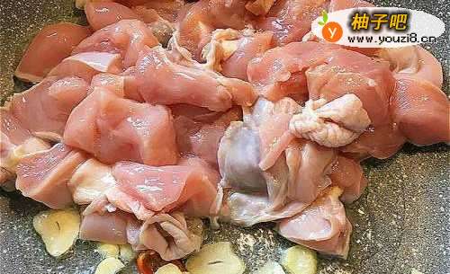 2不沾炒锅放一大匙油,开中小火,不需热油马上就可将切块的鸡胸肉、辣椒、蒜头一同入锅。