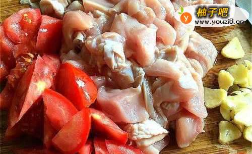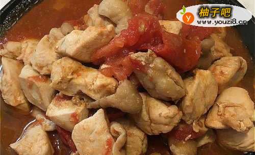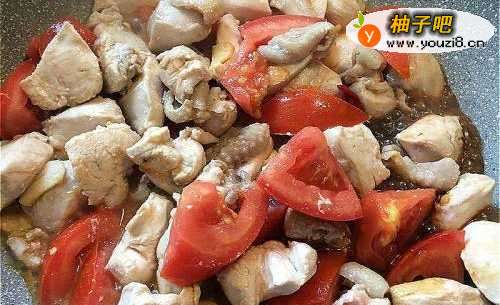 4接着放人切块的番茄。加一小匙盐和一小匙酱油膏,翻炒均匀,把鸡肉炒熟即可。