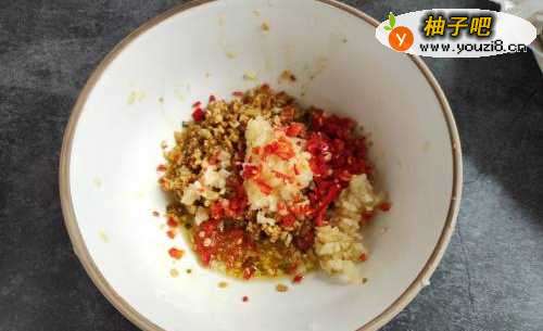 5盛入碗中,放入另一半的蒜末,和适量小米辣末拌匀,金银蒜蓉酱做好。