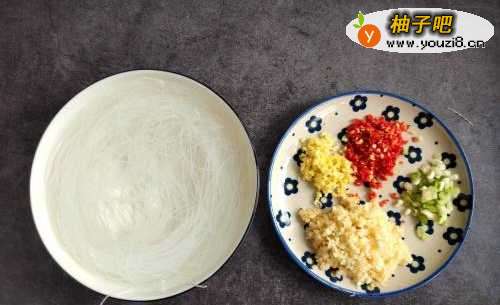 2粉丝用温水泡软,姜蒜剁末,小米辣剁末,葱切葱花