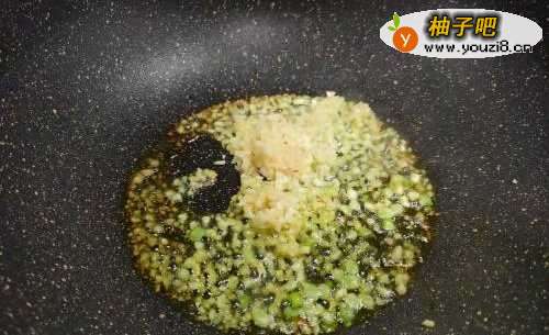 4起锅烧油,油一定要多一点,放入姜,葱白和一半的蒜末炒香,变得金黄关火倒出