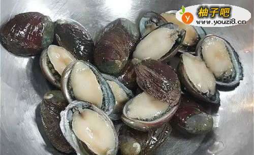 处理小鲍鱼,将嘴部黑黑的部分弄掉,用清水洗干净备用。