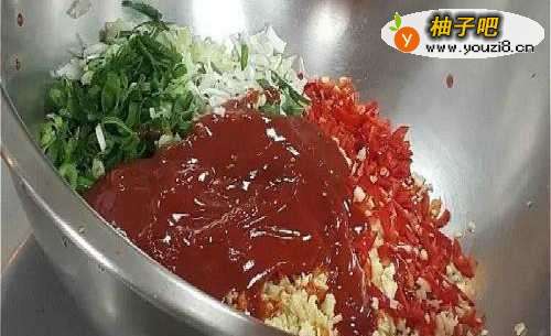 3将辛香料葱5、蒜仁、嫩姜、辣椒、香菜全部切碎末。