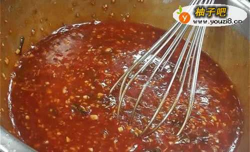 4放入番茄酱、白砂糖、白醋、乌醋、新鲜柠檬汁、 酱油、蚝油,搅拌均匀,调成五味酱。