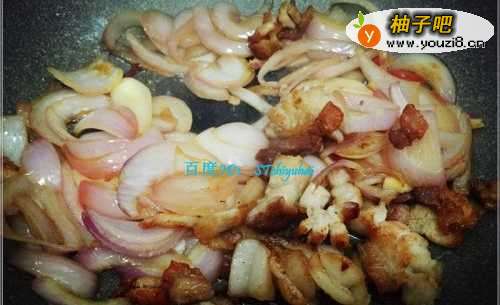 6洋葱差不多熟后倒入腌制的五花肉,混合翻炒一阵,加盐、料酒、醋等调味料,炒匀后试试味道,调节合适后关火装盘!