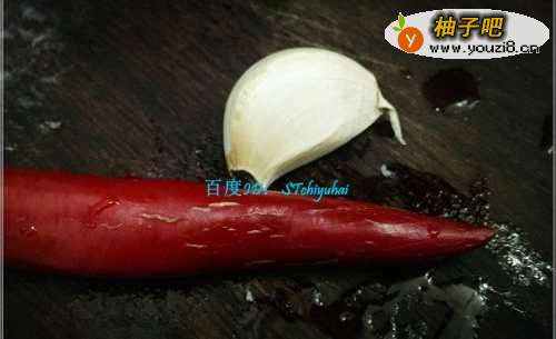4准备少许辅料:蒜头、辣椒,蒜头去皮切片,辣椒洗净斜切成薄片;油锅重新热起,加入蒜头、辣椒爆香。