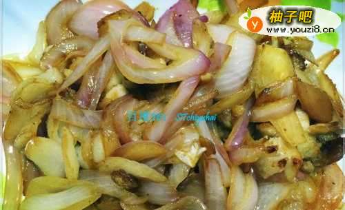 5先将洋葱片倒入翻炒,大火快炒,将洋葱炒软。