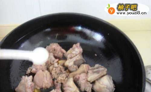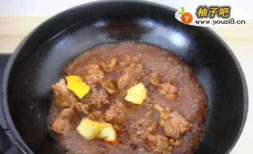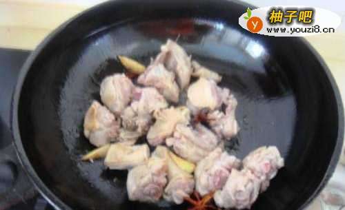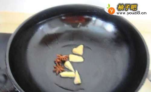 4锅内倒油,油温5分热时倒入生姜片和八角爆香