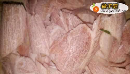 3把猪肉切片。如果是从冰箱中取出的猪肉,要先用水冲洗一下,这样比较好切;或者是提前拿出来,化一会。
