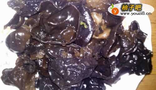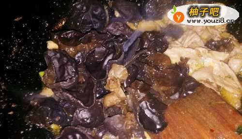 7猪肉片炒熟之后,下入木耳,炒一会之后把蒜末加入,然后再一起炒出蒜香味。