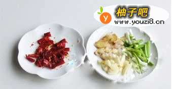 3干辣椒切段,葱、姜、蒜切片。