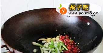 4锅置于旺火上,倒入油,烧热后,先下八角,将其炸出香味,再将葱、姜、蒜、干辣椒下入炒香。