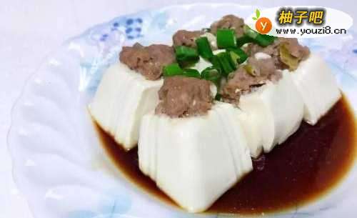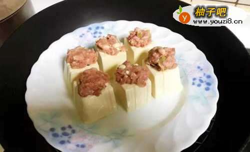 4将绞肉平均酿入豆腐,用中火隔水蒸10分钟