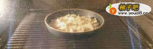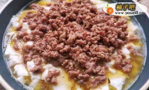 77.将炒好的肉末倒到蒸好的豆腐上,继续蒸2分钟