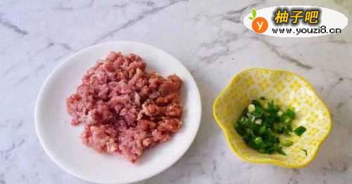 44.将准备好的肉切末,小葱切成葱花备用