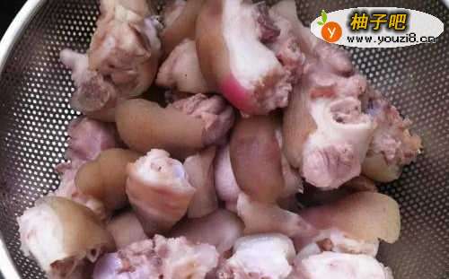 猪脚剁成大块,冷水放入锅中焯烫下,待大火煮开,浮沫煮出来了,将猪脚捞出,用温水冲洗下,控水。
